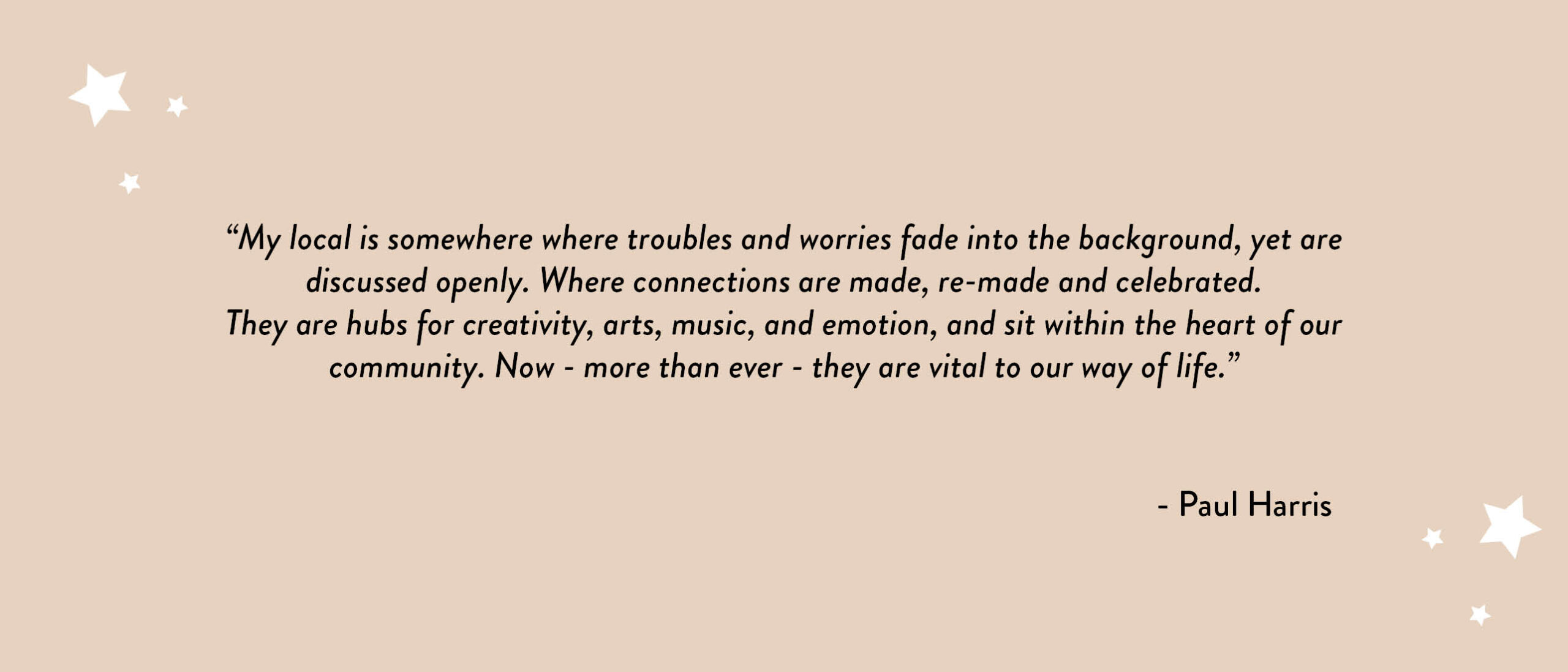 Pubs are a shining light in our communities. Not only do they bring people together to share drink, food, and to make memories, they also provide an essential space for individuals and community groups to meet, or even form.